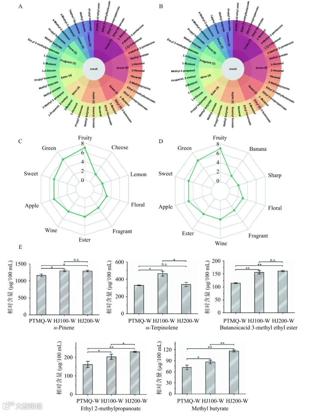注:PTMQ-W/HJ100-W比较组风味轮(A)和雷达图(C);PTMQ-W/HJ200-W比较组风味轮(B)和雷达图(D);HJ100-W及HJ200-W中上调幅度Top5的部分风味化合物(E)。*P<0.05,**P<0.01。
