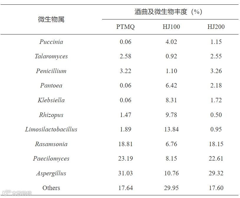 酒曲中的微生物在黄酒的风味形成中起着至关重要的作用,风味化合物的生成依赖于酒曲中微生物代谢的胞外酶及其自身对原料的分解。如:醇类化合物主要由酵母代谢生成,提供醇厚的口感与酒精味;酯类物质的生成与积累则源于微生物代谢的胞外酶所进行的酶促反应,提供果味、糖味及花香味。了解微生物群对黄酒风味形成的影响,对提高黄酒的整体品质至关重要。前期利用宏基因组测序技术研究发现黄精添加能够改变麦曲中的微生态结构,提高麦曲微生物群的生物多样性和均匀度。在它们丰度排名前10的优势微生物中,黄精的添加显著提高了锈菌属(Puccinia)、泛菌属(Pantoea)及克雷伯氏菌属(Klebsiella)的丰度,结果如表3所示。