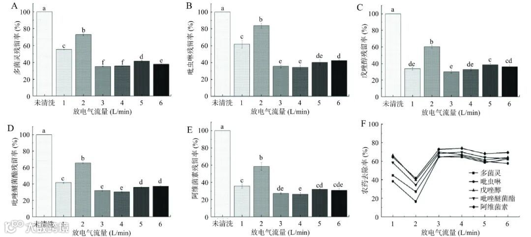 注:A、B、C、D、E分别为不同放电气流量下鸡心果表面多菌灵、吡虫啉、戊唑醇、吡唑醚菌酯和阿维菌素5种农药的残留率,F为不同放电气流量下鸡心果表面5种农药的去除率。