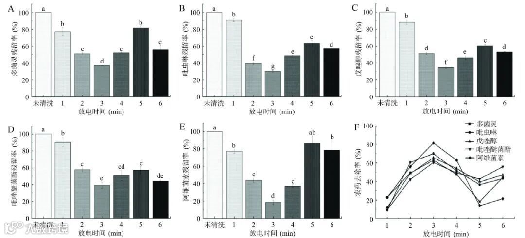 注:A、B、C、D、E分别为不同放电时间下鸡心果表面多菌灵、吡虫啉、戊唑醇、吡唑醚菌酯和阿维菌素5种农药的残留率,F为不同放电时间下鸡心果表面5种农药的去除率。