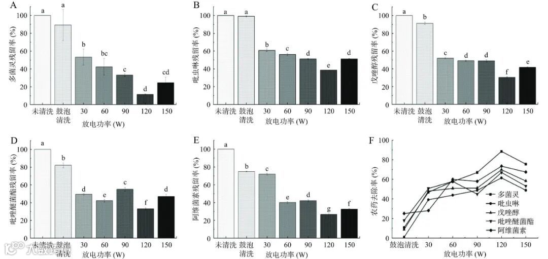注:A、B、C、D、E分别为不同放电功率下鸡心果表面多菌灵、吡虫啉、戊唑醇、吡唑醚菌酯和阿维菌素5种农药的残留率,F为不同放电功率下鸡心果表面5种农药的去除率。不同小写字母表示存在显著性差异,P<0.05,图3~图4、图6同。