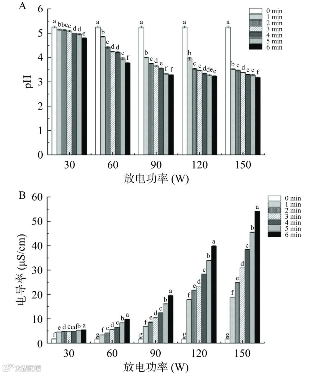 图 5 不同等离子体放电功率及时间对PAW pH(A)和电导率(B)的影响