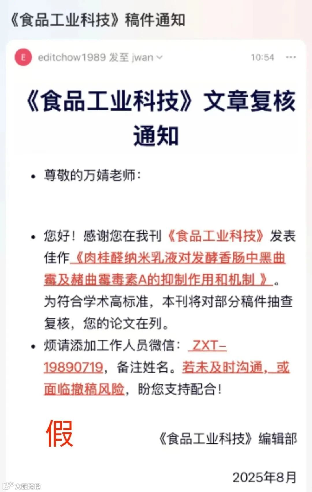 近期发现有不法分子假冒《食品工业科技》编辑部的名义,联系本刊作者添加微信进行论文复核、学术诚信抽查复核、文章数据发送、样刊登记等。为避免广大作者利益受到侵害,本刊郑重声明如下: