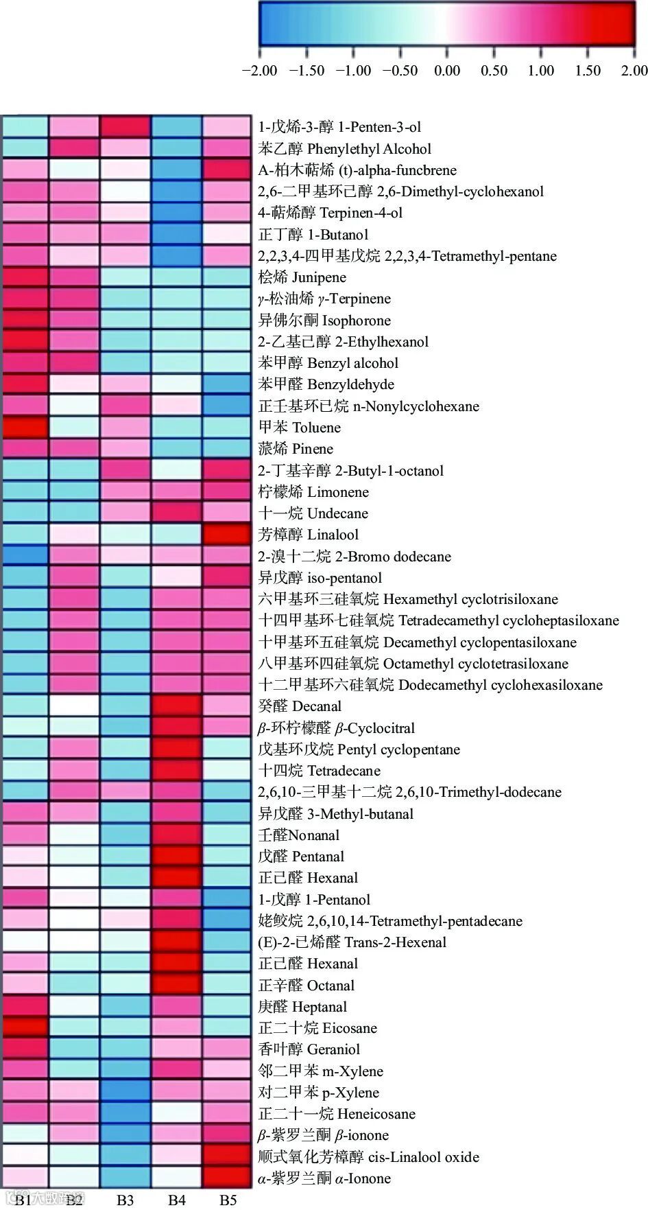 福鼎大毫茶白牡丹茶(B3)中大部分香气成分的OAV值,与其他品种相比较低。具有花果香气特征的癸醛、壬醛、1-戊醇和芳樟醇的OAV值在福鼎大毫茶中较为突出。值得注意的是,赋予花果香气息的β-环柠檬醛的OAV值仅在该品种中无法计算,且具有紫罗兰花香的α-紫罗兰酮OAV值也仅在该品种中小于1,这两种香气成分对有效区分福鼎大毫茶和其他品种的香气特征可能有着积极作用。