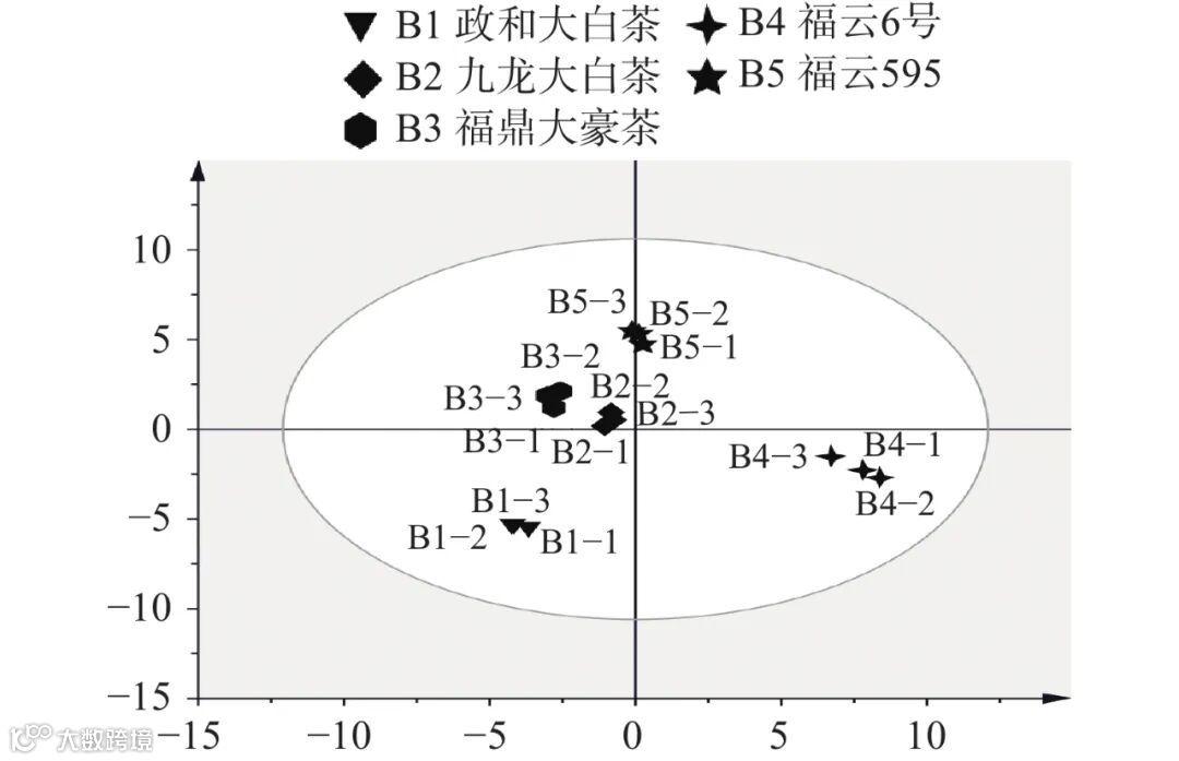主成分分析是一种可直观反映样本成分构成近似度的统计方法,样本间的相似度越高则距离越近。如图2所示,5个不同品种白牡丹茶的香气成分在得分散点图上实现了品种的区分,九龙大白茶(B2)、福鼎大毫茶(B3)和福云595(B5)均分布在纵轴的正半轴上,政和大白茶(B1)和福云6号(B4)均匀分布纵轴的负半轴上。主成分分析结果表明本次检测出的香气成分用于不同品种白牡丹茶的香气特征的分析具有可行性。