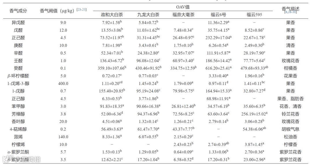 Table 2. OAV values of aroma components in different varieties of white peony tea