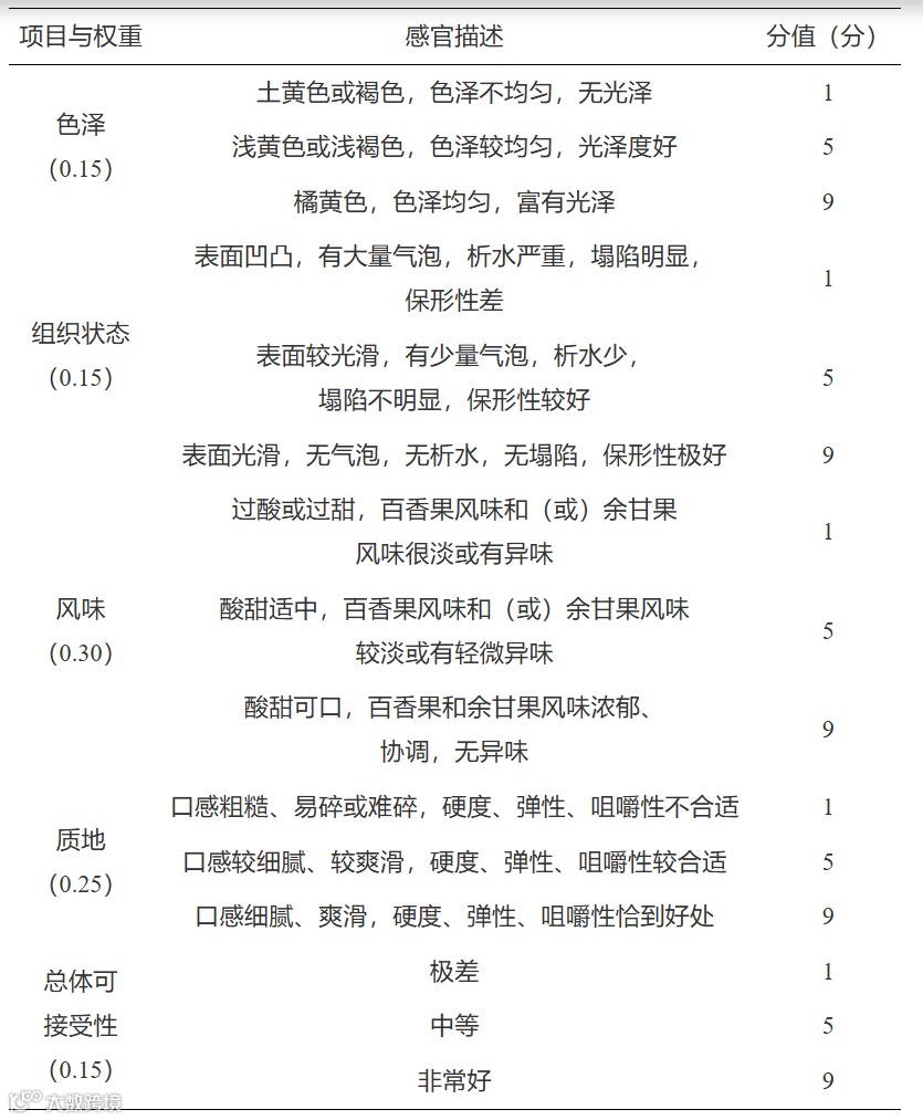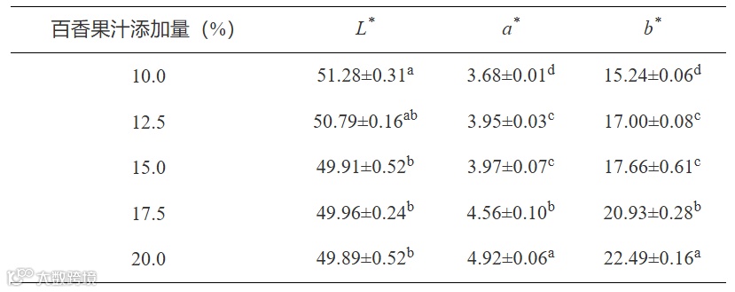 表 3 百香果汁添加量对复合果冻色泽的影响