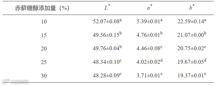 表 7 赤藓糖醇添加量对复合果冻色泽的影响