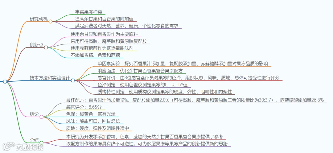 北部湾大学食品工程学院,广西高校北部湾海产品高值化利用与预制食品重点实验室,钦州市食品风味分析与调控重点实验室的陈美花,廖杏莲,牛改改,蓝尉冰,庞庭才等人主要介绍了响应面法优化余甘果百香果低糖复合果冻配方的研究目的、意义及方法。通过采用功能性胶凝剂、低热量甜味剂以及营养丰富、保健功效突出的果蔬为原料,结合可得然胶与魔芋胶、黄原胶的复配,并添加赤藓糖醇,将余甘果泥、百香果汁、复配胶、赤藓糖醇等原料用于果冻的生产,可以提高果冻的营养价值和保健功效,减少胶凝剂的用量,提供天然的酸度,改善果冻的风味和色泽,为消费者尤其是糖尿病人或减重人群提供新的选择,促进经济发展。