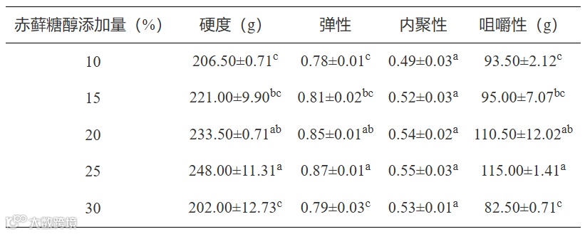 表 8 赤藓糖醇添加量对复合果冻质构特性的影响