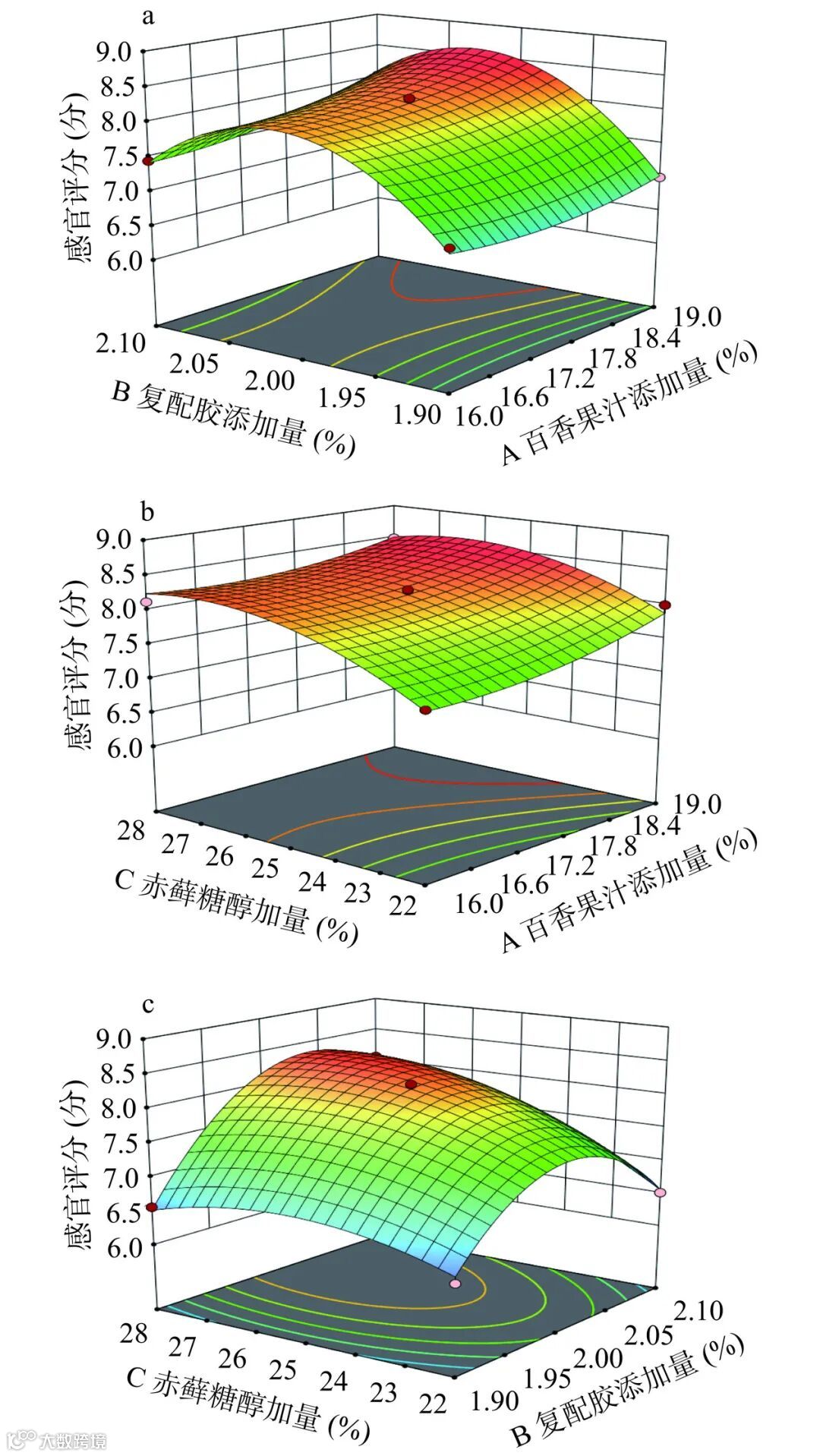 Figure 4. Response surface diagram of the interaction between two factors on sensory score