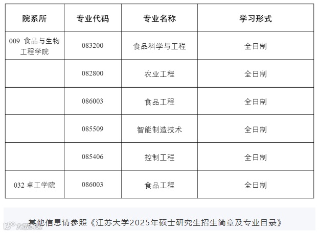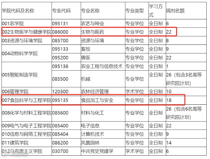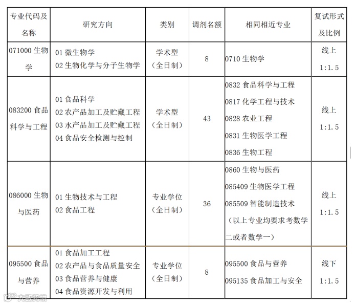食品科学与工程(学硕083200),9个;绿色食品加工与安全工程(学硕0832J5),3个;生物工程(学硕083600),9个;生物与医药(专硕,086000),6个,学习方式为全日制。
