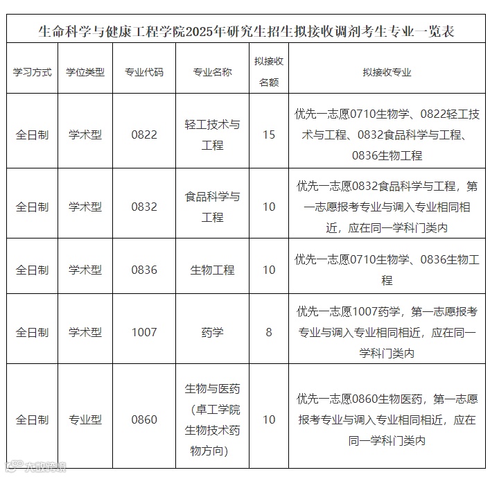 调剂专业包含食品科学与工程(学硕)、食品加工与安全(专硕,含国内和国际班)、药学(专硕),均采用线上面试。