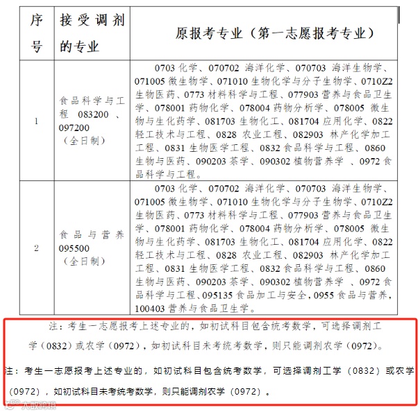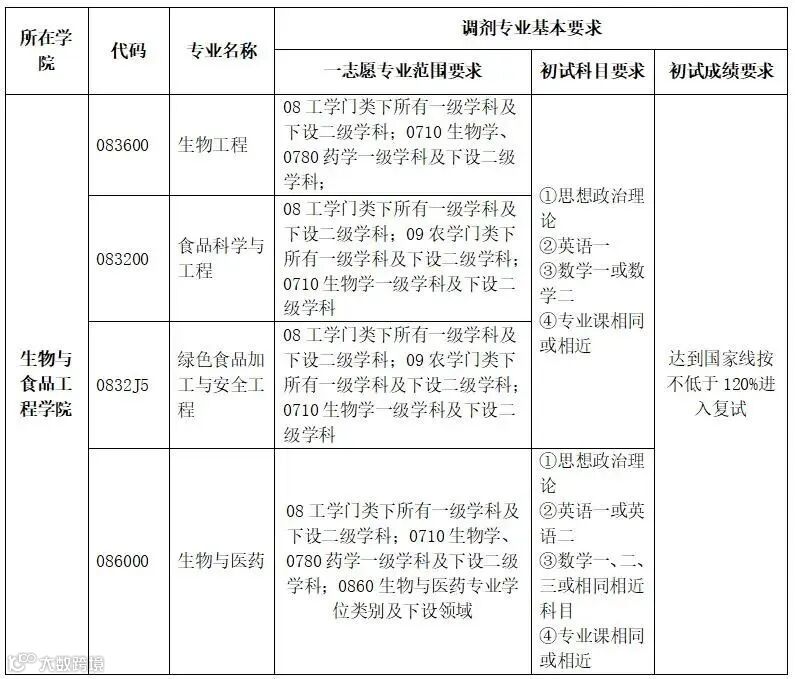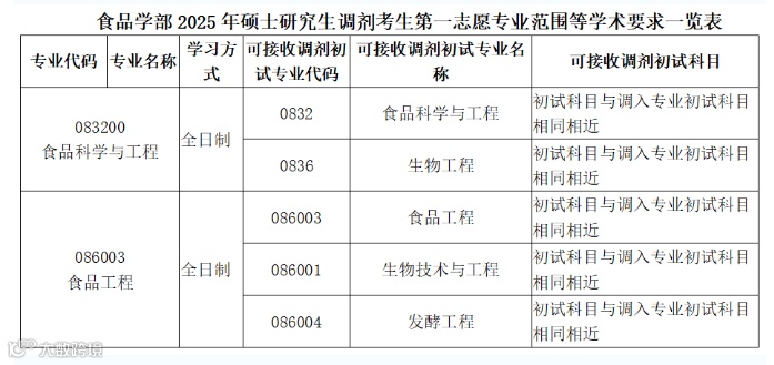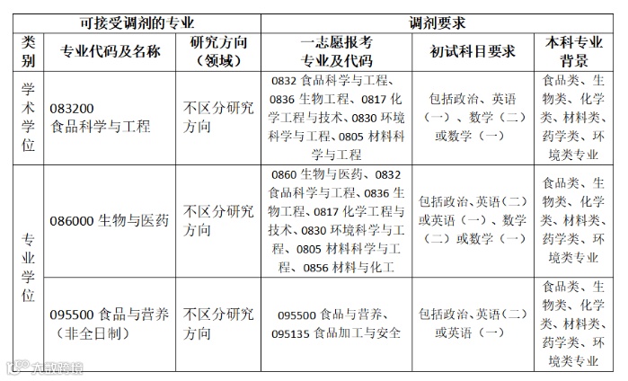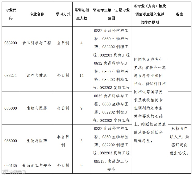 调剂食品科学与工程(0832)的考生:优先接受报考食品科学与工程(0832、0972)的考生。可以接受生物医学工程(0831)、 生物工程(0836)、生物与医药(0860)、轻工技术与工程(0822)、机械工程(0802)、机械(0855)、化学工程与技术(0817)、材料科学与工程(0805)、农业工程(0828)、环境科学与工程(0830)、计算机科学与技术(0812)等同一学科门类内的调剂考生。优先专业按照考生专业(领域)或方向初试成绩排序进入复试,其他专业再进行排序。
