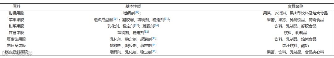 果胶的酯化度通常因原料的多样性和提取工艺的不同而不同。酯化度的大小与果胶的乳化性、凝胶性等性能有着紧密的联系。高酯果胶可用作增稠剂、凝胶剂、稳定剂和乳化剂,用于制造果冻、果酱、酸奶以及果汁饮料、蛋黄、酱等,主要用于生产高糖分高热量的食品。柑橘皮和苹果渣则常用于商业化高酯果胶的生产。而低酯果胶在食品加工中常用来加工低糖分低热量的功能性保健食品,可用于糖果的糖衣、果肉型饮料、烘烤食品等的制作。目前,低酯果胶一般都是由温和的酸或碱处理高酯果胶转变而来。向日葵盘、西瓜皮是天然低酯果胶的来源之一。因此,不同原料提取的果胶的结构、功能特性不同,在食品中的应用也不同。表 2 中列出了部分果胶作为食品添加剂的基本性质。