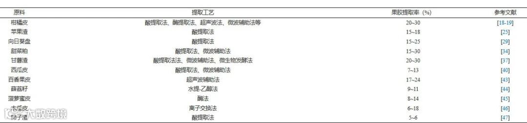目前国内规模较大的果胶生产厂家主要以柑橘和苹果渣为原料,此外也有以向日葵盘、甜菜粕、甘薯渣、西瓜皮等为原料进行商业化果胶生产。