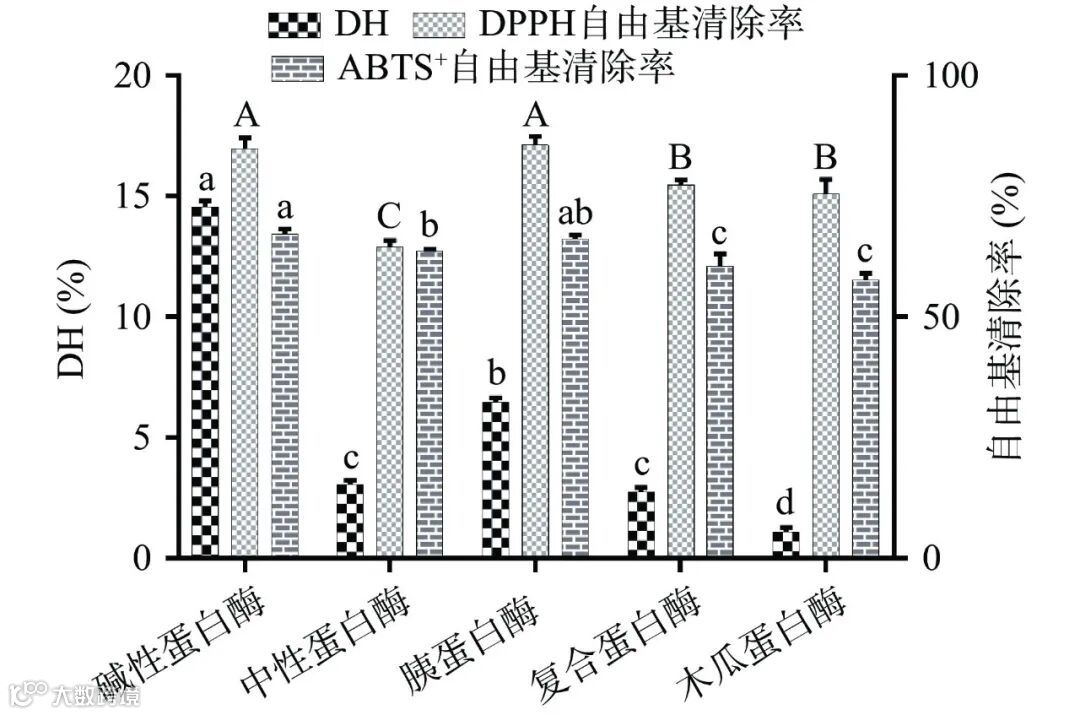 Figure 4. Effects of protease types on free radical scavenging rate and degree of hydrolysis of SeCP hydrolysatese