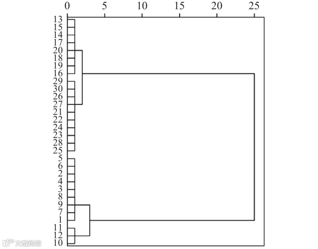 如图 5 所示,当欧氏距离为 5 时,30 个样品聚集为 2 类群:第 1 类群为 1~12 号茶样,该类群绿茶的采制时间在小满节气之前,主要特征是氨基酸、可溶性糖、EGCG、ECG 和儿茶素品质指数高于总体的平均值,而酚氨比低于总体的平均值,因此,在感官上呈现滋味鲜爽,收敛性好,回甘明显,综合品质高;第2 类群为 13~30 号茶样,为夏秋茶,综合品质开始下降。而当欧氏距离为 1 时,第 1 类群可进一步分为2 个亚类群:第 1 亚类群为 1~9 号茶样,采制时间为谷雨之前,主要特征是氨基酸含量大于 5%,可溶性糖大于 6.1%,EGCG 含量大于 9%;第 2 亚类群为10~12 号茶样,采制时间为谷雨至小满之间,雨水开始增多,主要特征是 ECG 下降至 1.3% 以下,氨基酸含量下降至 6.1% 以下;第 2 亚群也可分为 2 个亚类群:第 3 亚类群为 13~20 号茶样,采制时间为谷雨至初伏,主要特征是氨基酸含量在 4%~5% 之间,可溶性糖大于 5.4%~6.1%,水浸出物大于 46%,因此,在感官上滋味浓郁,但鲜爽度不足;第 4 亚群为 21~30号茶样,所有的生化成分均低于总体平均值,因此,滋味寡淡,综合品质较差。