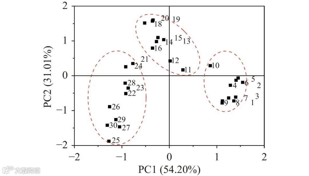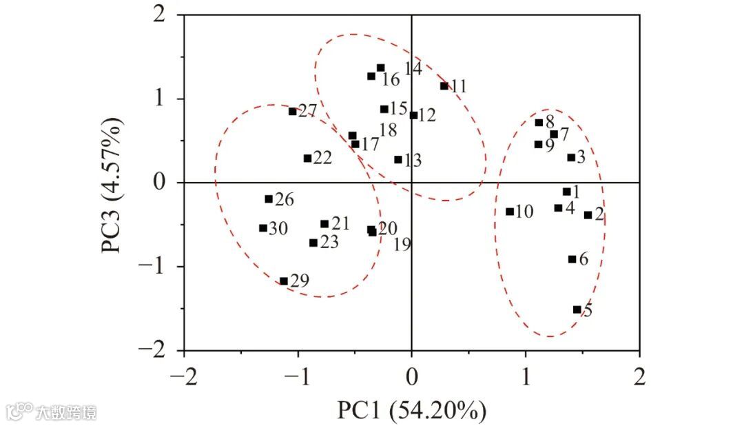主成分分析得分图已被广泛应用于反映样品与品质指标之间的关系。由图 2~图 3 可以看出,根据 PC1、PC2 和 PC3 的得分情况,大致可以分三个部分:其中,春茶样品(1~10 号)均在 PC1 的正向区间(第一象限和第四象限),说明这些样品中的氨基酸、可溶性糖和儿茶素含量较高,茶多酚和咖啡碱的含量适中,茶汤鲜爽回甘浓郁,因此春茶的品质较优,排名靠前 ;夏茶样品 ( 11~20 号 )均位于 PC2 和PC3 的正向区间(第一象限和第二象限),说明这些样品的水浸出物和茶多酚含量较高,茶汤较浓郁,因此,排名也相对靠前;秋茶样品(21~30 号)位于 PC1 和PC2 的负向区间(第三象限和第四象限),说明秋茶中的品质成分都较低,茶汤寡淡,因此,排名最后。