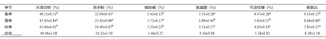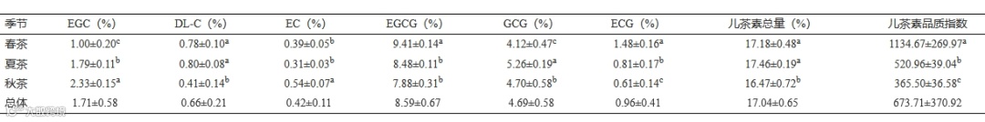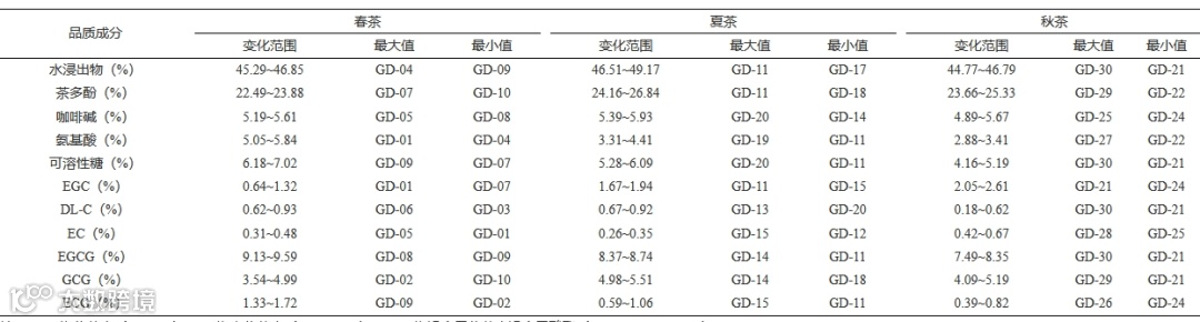 茶树为多年生植物,且呈现季节轮次性生产,不同的生产季节,其代谢特征有较大的差异。一般认为较低的温度有利于氮素代谢,促进氨基酸等氮代谢产物的合成与积累,而较高的温度有利于茶树碳代谢,有利于茶多酚含量的提高。而且,在茶树生产发育过程中,不同叶位的生化成分含量易受叶片嫩度影响,EGCG、咖啡碱和氨基酸等含量都随叶位增加而呈现下降趋势,即叶片越嫩含量越高。邵阳市属典型的中亚热带湿润季风气候,四季分明,光热充足,雨水充沛,且雨热同季。春季平均气温在 10~20 ℃ 之间,气温适中,碳代谢和氮代谢都比较旺盛,因此,氨基酸含量高,茶多酚含量适中,在感官上呈现滋味鲜爽,香气馥郁浓烈;而夏季平均气温上升到 30 ℃ 左右,碳代谢加剧而氮代谢受到抑制,因此,茶多酚含量高而氨基酸含量低,成品茶苦涩味重;秋季的气温介于春季和夏季之间,雨量减少,特别是茶树历经春、夏两季采收后,营养亏缺,因此,秋茶内含物质贫乏,茶叶滋味淡薄。