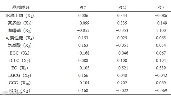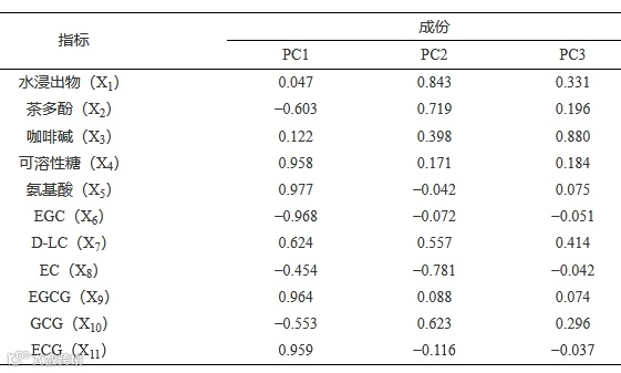 由表 8 可知,第 1 主成分的贡献率为 54.282%,第 2 主成分的贡献率为 31.024%,第 3 主成分的贡献率为 4.563%,前 3 个主成分的累积贡献率为 89.869%,超过 85%,可解释宝庆桂丁绿茶内在品质的大部分信息,因此选择前 3 个主成分对宝庆桂丁绿茶的内在品质进行分析。