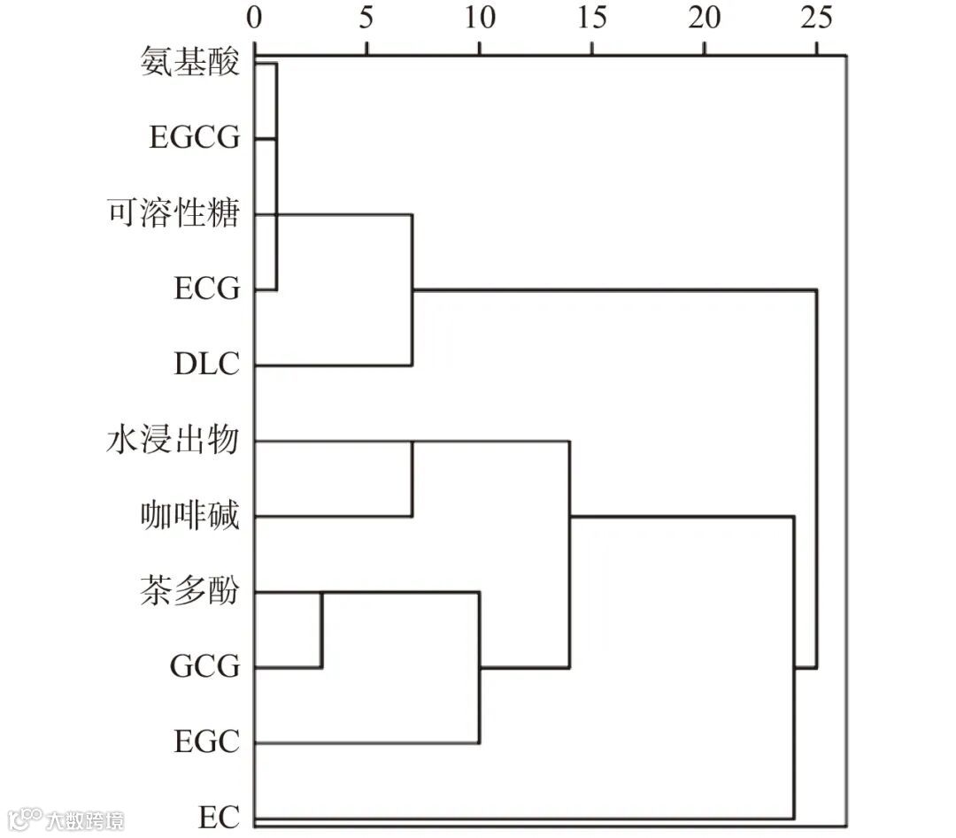 如图 4 所示,当距离为 10 时,可以将宝庆桂丁绿茶生化成分含量指标分为 4 个大类,第 1 类为氨基酸、可溶性糖、EGCG、ECG 和 DL-C;第 2 类为水浸出物和咖啡碱;第 3 类为茶多酚、GCG 和 EGC;第 4 类为 EC。结合主成分载荷分析结果,第 1 类指标是第 1 主成分的正载荷量,也就是说这些指标值越大,模型评价得分越高,宝庆桂丁绿茶的品质越好。结合相关文献报道,最终确定氨基酸、可溶性糖、EGCG、ECG 为综合评价宝庆桂丁绿茶品质优劣的关键性指标。