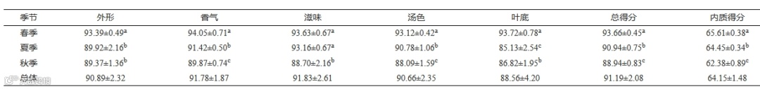 a.宝庆桂丁绿茶品质优异,感官评定的各项得分均在 90 分左右,品种地域特色明显。宝庆桂丁绿茶的综合品质季节性变化明显,春茶品质明显优于夏秋茶,夏茶品质优于秋茶。