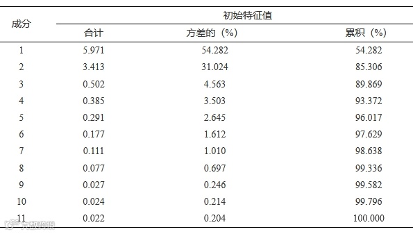 以 30 个样品的 11 个主要生化成分含量,利用 SPSS26.0 软件对其进行了主成分分析,结果见表 8~表 9。