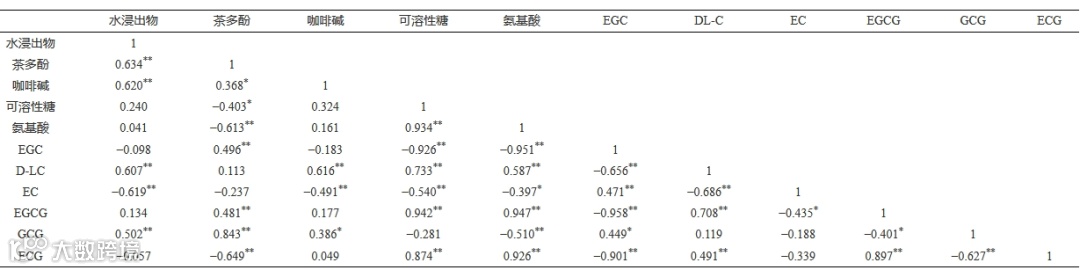 为探讨宝庆桂丁绿茶的品质并建立其评价体系,本研究选取 30 份宝庆桂丁绿茶样品,对感官品质进行评定,并测定水浸出物、茶多酚、咖啡碱、氨基酸、可溶性糖等生化成分的含量和儿茶素组成。同时,采用主成分分析(principal component analysis,PCA)和聚类分析(cluster analysis,CA)对宝庆桂丁绿茶品质进行综合评价,并建立宝庆桂丁绿茶品质评价模型。结果表明:宝庆桂丁绿茶感官综合评价,春茶最佳,夏茶次之,秋茶最差;宝庆桂丁绿茶的水浸出物含量为 44.77%~49.17%,茶多酚含量为 22.49%~26.84%,咖啡碱含量为 4.89%~5.93%,氨基酸含量为 2.88%~5.84%,可溶性糖含量为 4.16% 至 7.02%,呈现高氨基酸、高咖啡碱和高 EGCG 的特征,符合名优绿茶的生化特征;不同采摘时期宝庆桂丁绿茶生化成分含量之间呈现极显著相关性,其中水浸出物、茶多酚、咖啡碱、D-LC、EC、GCG 极显著相关(P<0.01),茶多酚、咖啡碱、可溶性糖显著相关(P<0.05);主成分分析法提取出 3 个主成分因子累积方差贡献率达到 89.869%,并建立宝庆桂丁绿茶综合品质评价模型为F=0.543F1+0.310F2+0.046F3;根据聚类分析结果可知,氨基酸、可溶性糖、EGCG 和 ECG 等 4 个生化成分含量指标可以用来综合评价宝庆桂丁绿茶品质的优劣,同时可以将宝庆桂丁绿茶依据采制时间划分为 2 个类群,4 个亚类群,其综合品质依采制时间逐渐降低。本研究揭示了宝庆桂丁茶生化特征,建立了可行的品质评价模型,并确定了关键品质指标,为宝庆桂丁绿茶的品种选育和资源开发利用奠定理论依据。