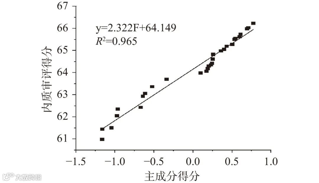 为了验证该模型评价宝庆桂丁绿茶品质的可行性,我们对 30 个样品的模型得分和内质(汤色、香气和滋味)审评结果进行了比较,结果见表 10 和图 1。从图 1 的结果可以看出,模型计算得分与内质审评结果之间有很好的一致性,呈现出良好的线性关系,决定系数 R2 为 0.965。这说明主成分分析法在对数据进行降维处理的过程中保留了绝大部分的信息,不会出现明显的失真,能够较为全面客观地反映宝庆桂丁绿茶的品质优劣性。
