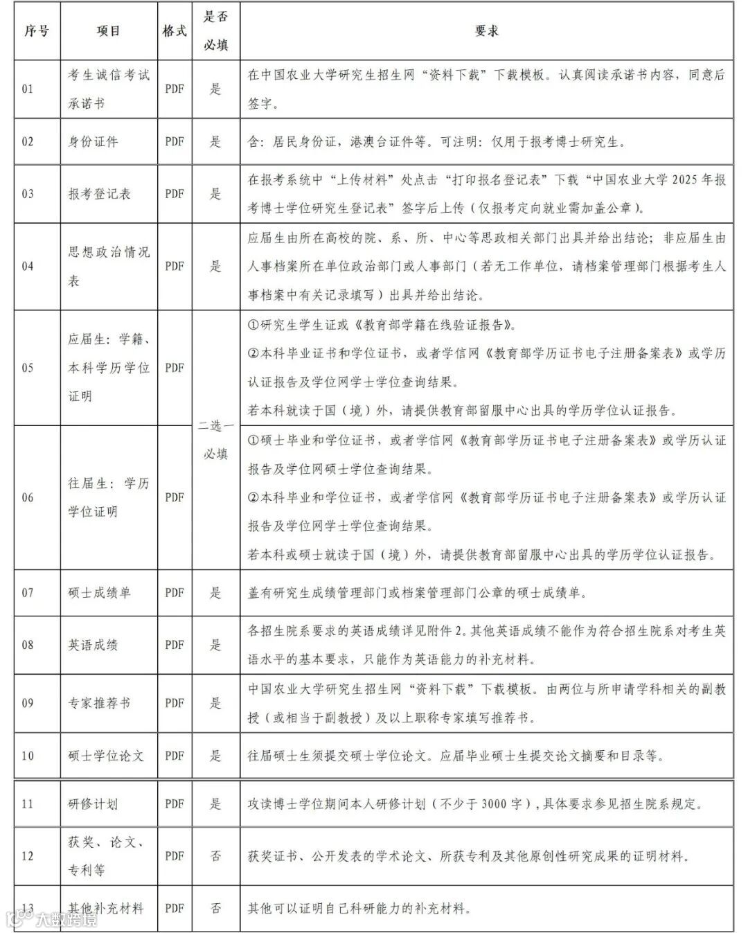 直博生和硕博连读生通过系统自行打印“中国农业大学2025年报考攻读博士学位研究生登记表”,附两封纸质版“专家推荐书”和一份“思想政治情况表”(中国农业大学研究生招生网--资料下载),一并交招生院系,以便存入个人人事档案。
