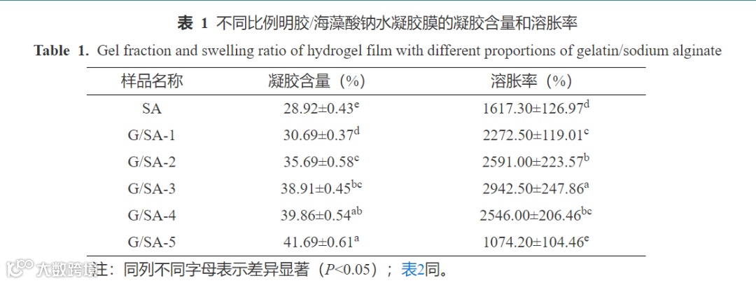 如表1所示,水凝胶膜的凝胶含量随明胶/海藻酸钠比例的升高而显著升高(P<0.05),但在G/SA-3处理组之后,即使G/SA比例继续升高,处理组之间的凝胶含量也未表现出显著差异(P>0.05)。这可能是由于明胶/海藻酸钠比例的升高,水凝胶膜的交联密度逐渐增大,表现为凝胶含量的增加。而当明胶/海藻酸钠的比例过高时,二者的交联度趋于饱和,表现为处理组间的凝胶含量无显著差异(P>0.05)。综上,明胶可以提高单一海藻酸钠水凝胶膜的凝胶含量和溶胀率,且G/SA-3(3:6)处理组具有最佳的溶胀率和凝胶含量。