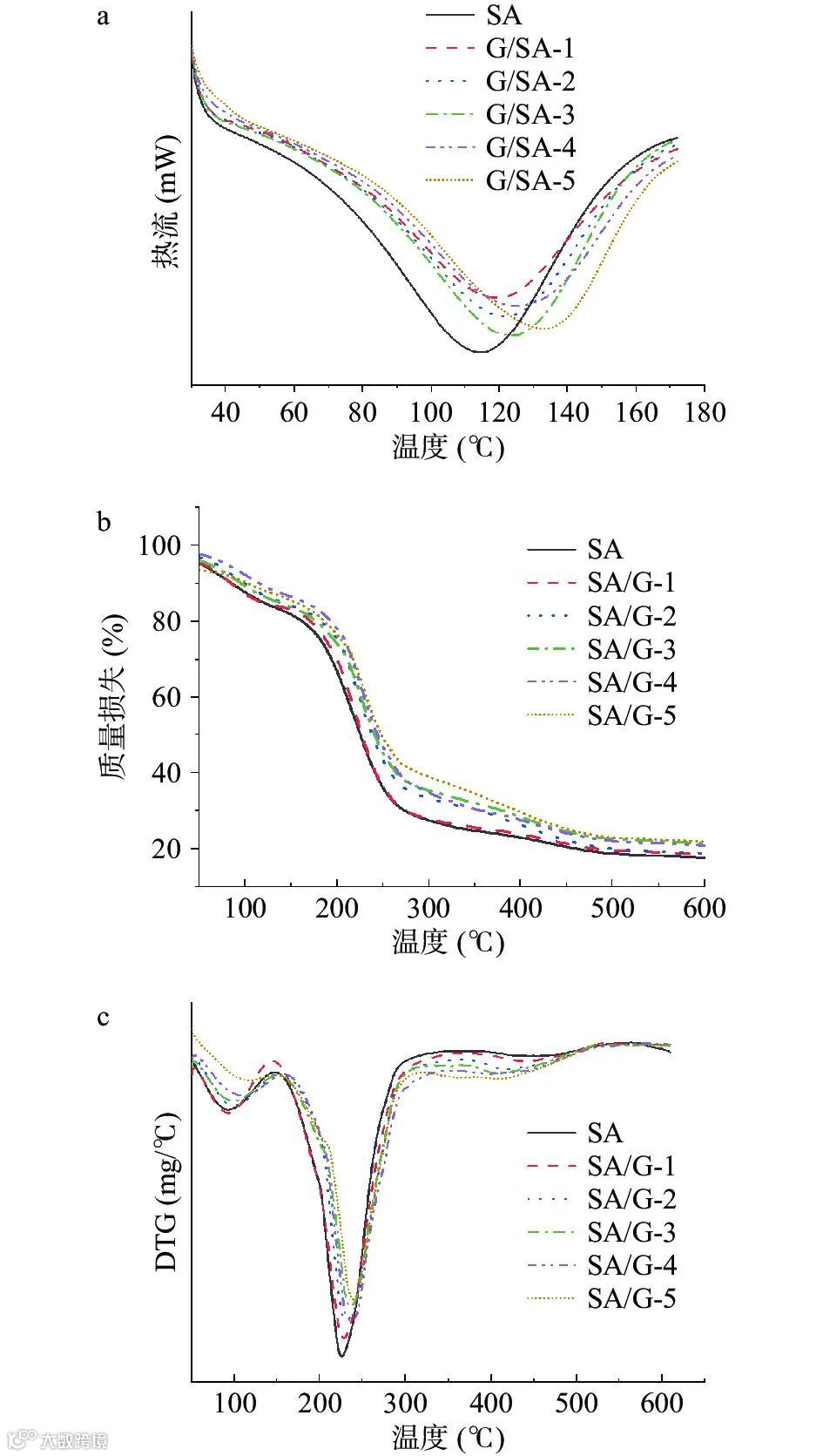 图 7 不同比例明胶/海藻酸钠水凝胶膜的DSC曲线(a)、TGA曲线(b)和DTG曲线(c)
