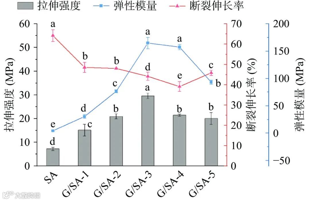 图 6 不同比例明胶/海藻酸钠水凝胶膜的机械性能