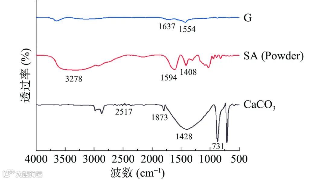 图 1 海藻酸钠、明胶和CaCO3的红外光谱图