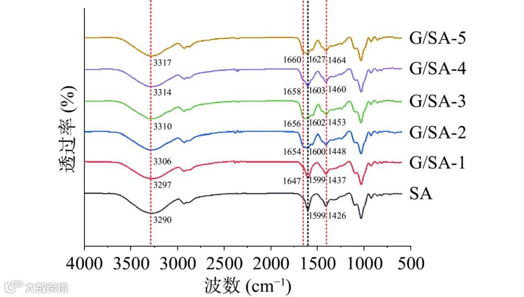 图 2 不同比例明胶/海藻酸钠水凝胶膜的红外光谱图