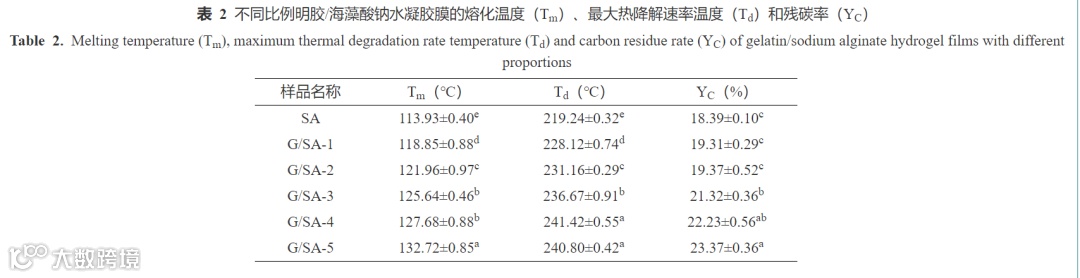 图7(c)为不同比例明胶/海藻酸钠水凝胶膜的DTG图,如表2所示,SA水凝胶膜的最大热降解速率温度(Td)为219.24 ℃,G/SA水凝胶膜的Td均显著高于SA水凝胶膜(P<0.05),而且随着G/SA比例的升高,即明胶添加量的增加,Td也逐渐升高(228.12~241.42 ℃)。这是因为在GDL的作用下,海藻酸钠和明胶发生了聚电解质作用,使水凝胶膜的交联密度增大,而海藻酸钠和明胶分子间的氢键也增强了水凝胶膜的热稳定性,进而使多糖碳链的分解受到抑制。Xiao等的研究发现明胶的加入能显著提升海藻酸钠薄膜的热稳定性。上述结果表明:明胶的引入可以显著增强海藻酸钠水凝胶膜的热稳定性,且随着明胶/海藻酸钠比例的升高,水凝胶膜的热稳定逐渐增强。