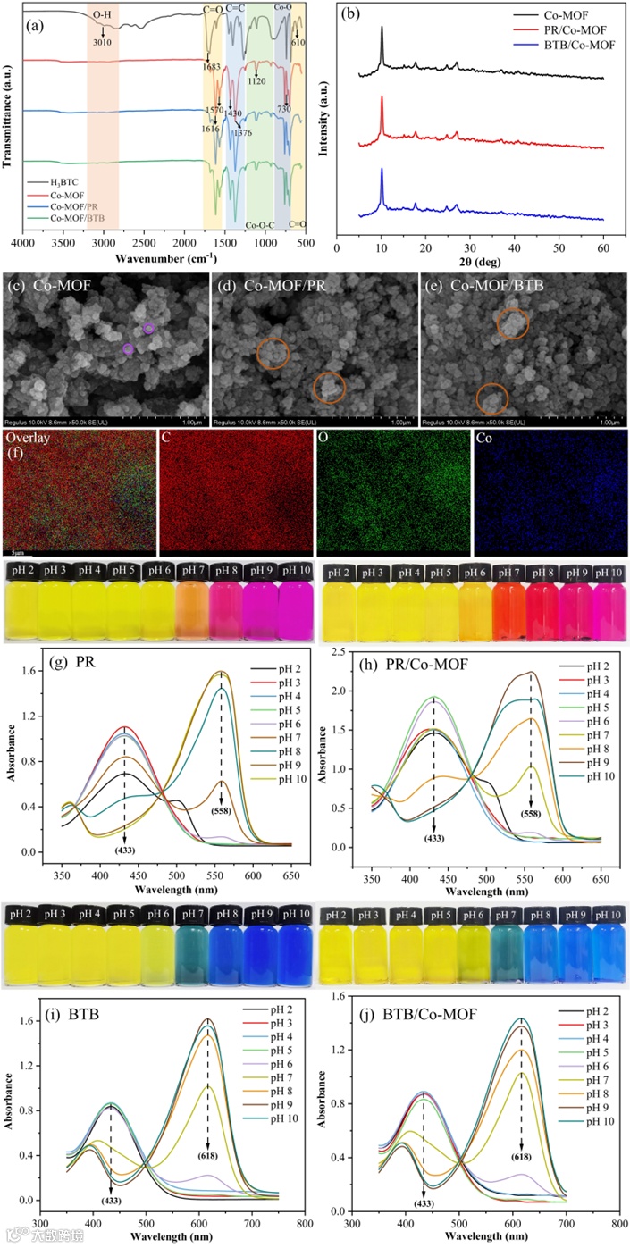 图2. Co-MOF、Co-MOF/PR和Co-MOF/BTB的表征和颜色响应