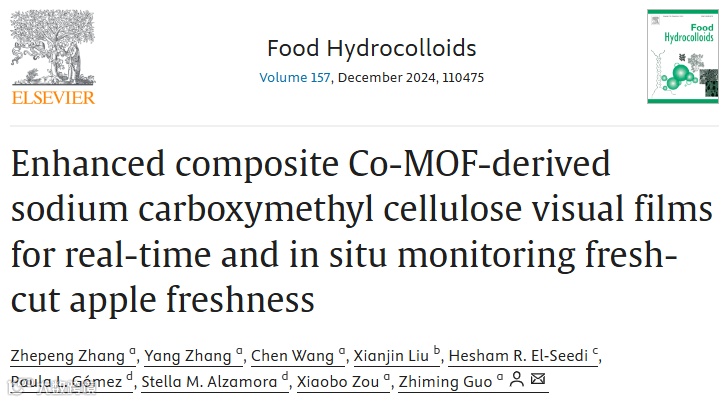 ●近日,江苏大学郭志明教授课题组在国际Top期刊《Food Hydrocolloids》(Q1,IF2023=11.0)上发表了题为“Enhanced composite Co-MOF-derived sodium carboxymethyl cellulose visual films for real-time and in situ monitoring fresh-cut apple freshness”的研究论文。该研究第一作者为江苏大学食品与生物工程学院博士研究生张浙鹏,通讯作者为江苏大学食品与生物工程学院郭志明教授,瑞典乌普萨拉大学的Hesham R. El-Seedi教授、阿根廷布宜诺斯艾利斯大学的Stella M. Alzamora院士和Paula L. Gómez教授也参与了论文的研究工作。该研究揭示了多功能纳米Co-MOF填料在食品智能包装领域中的创新应用,获国家重点研发计划国际合作项目(2023YFE0107100)等资助。