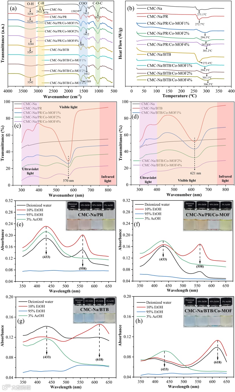 Co-MOF填料还改善了CMC-Na包装膜的防潮性、热稳定性、染料的抗迁移性能以及紫外可见光阻隔性。