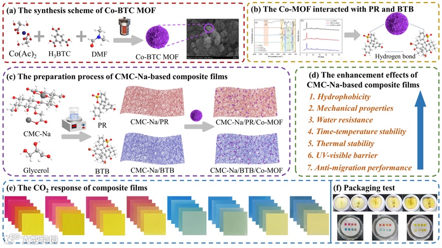 方案. (a) Co-BTC MOF的合成方案,(b) Co-MOF与PR和BTB的交互示意图,(c) CMC-Na基复合膜的制备工艺,(d)增强效果,(e) CO2响应,(f)包装试验