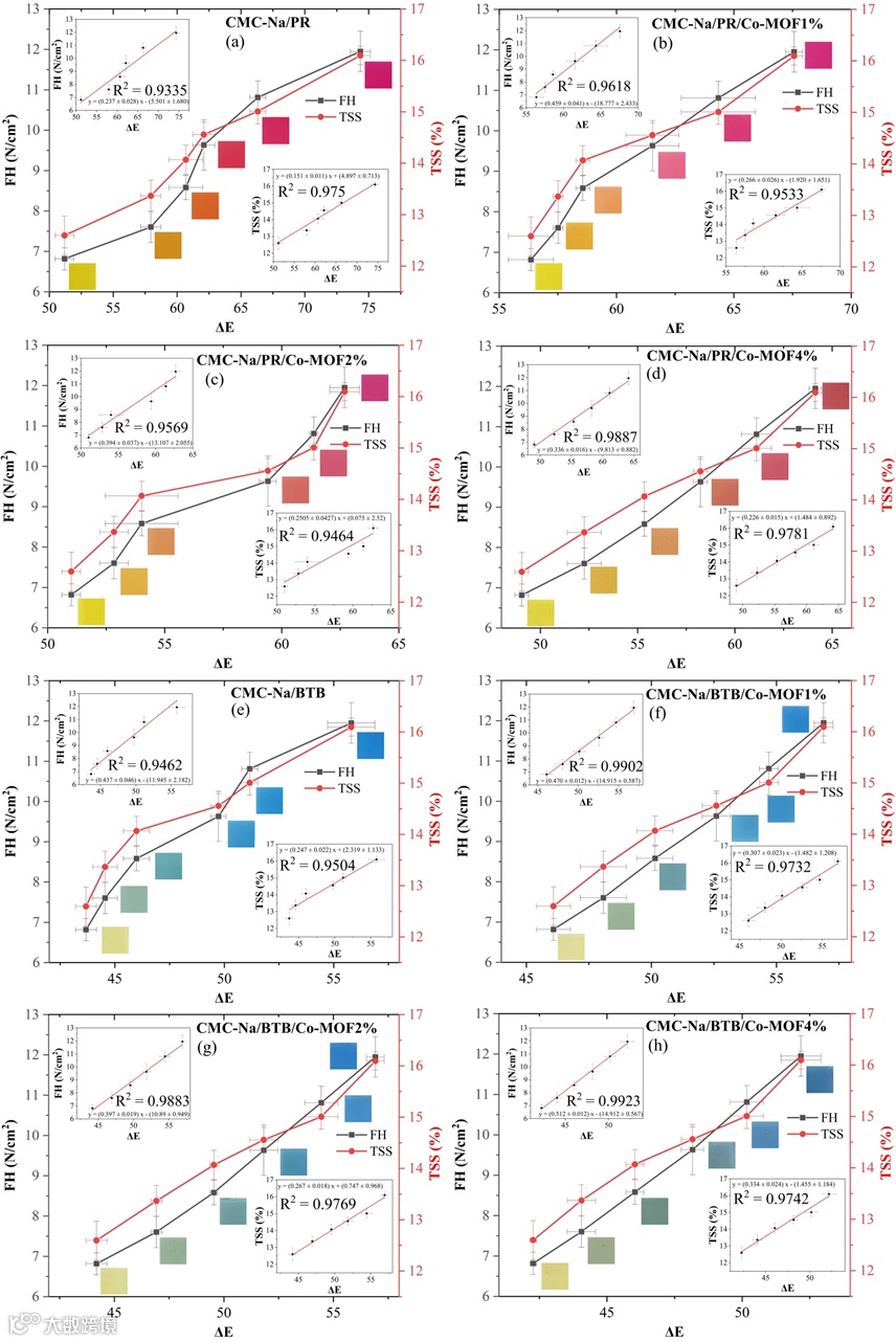 本文探讨了添加Co-MOF后CMC-Na基薄膜表现出优异的防水性、时间-温度稳定性和力学性能。值得注意的是,Co-MOF基复合膜表现出增强的紫外-可见光阻隔性、染料的抗迁移性能和热稳定性。最后,Co-MOF基薄膜的总色差值(ΔE)与鲜切富士苹果的硬度和总可溶性固形物(TSS)分别存在显著的线性响应(R2=0.9923和0.9781)。研究结果表明,含多功能MOF纳米填料的CMC-Na基复合膜作为可视化监测手段具有巨大应用潜力。