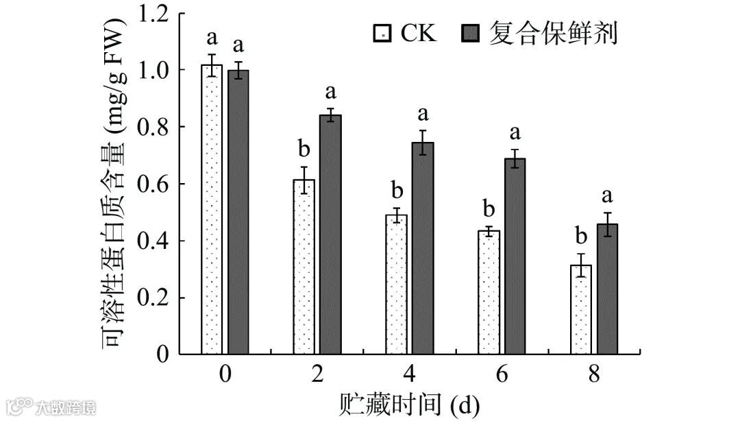 图 6 复合保鲜剂对双孢蘑菇可溶性蛋白质含量的影响