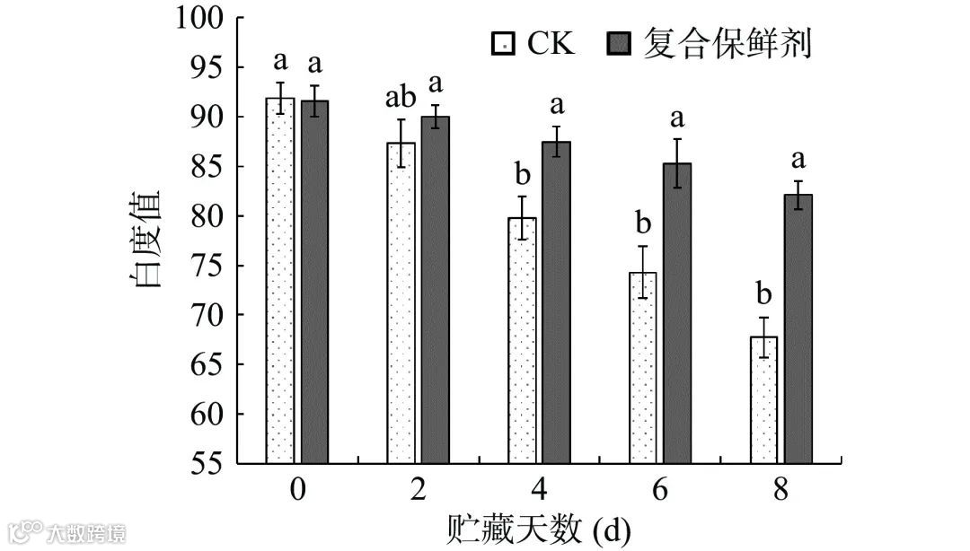 图 1 复合保鲜剂对双孢蘑菇白度的影响