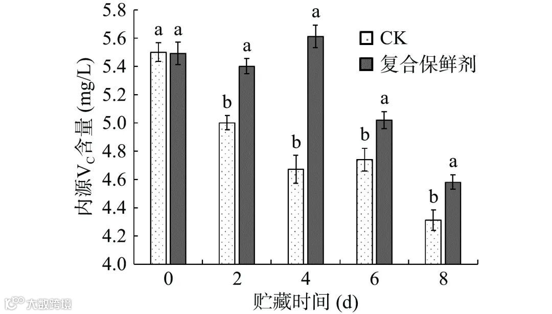 图 8 复合保鲜剂对双孢蘑菇内源VC含量的影响