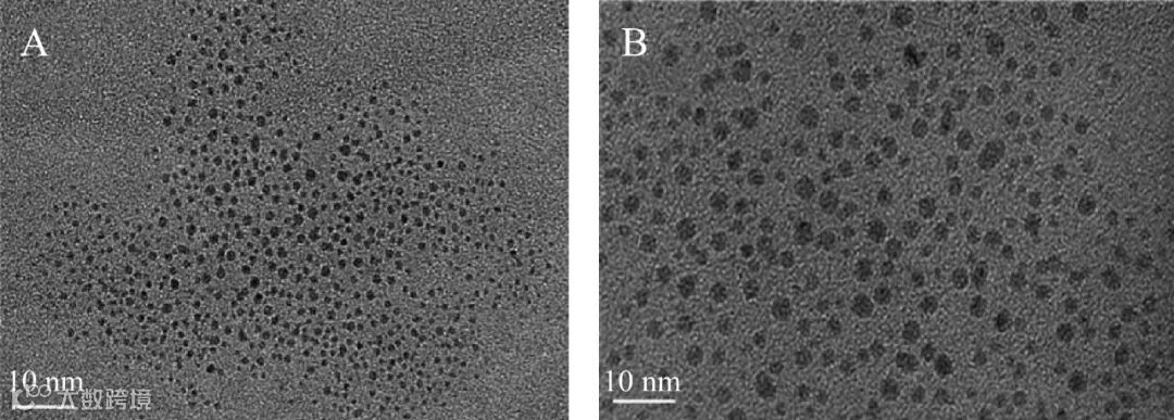 图 2 正常DNA-AgNCs(A)和分子拥挤DNA-AgNCs(B)的电镜图像