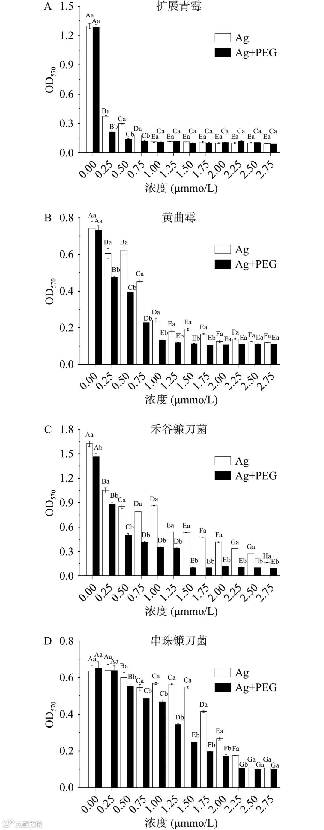 Figure 3. OD values of four fungi and two DNA-AgNCs cultured for 3 d