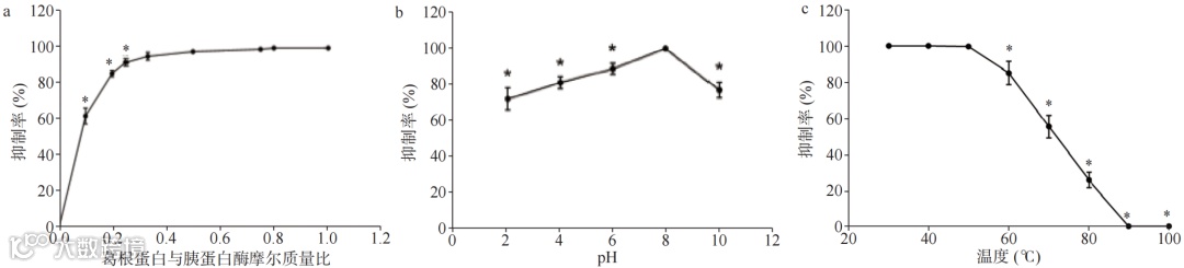 结果表明PP为一类尚未报道的胰蛋白酶抑制剂,其在pH2~10环境中具有较好稳定性,在20~50 ℃温度范围内具有稳定性,但更高温度会造成失活,这些特性与大豆Kunitz型胰蛋白酶抑制剂较为相似。