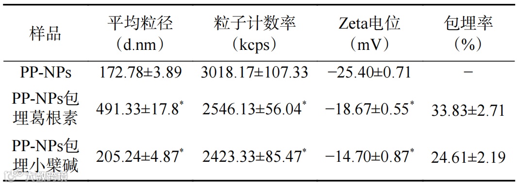 包埋实验结果表明PP-NPs对疏水性的葛根素及(热)水溶性的小檗碱均具有装载能力,装载率分别为33.83%与24.61%。