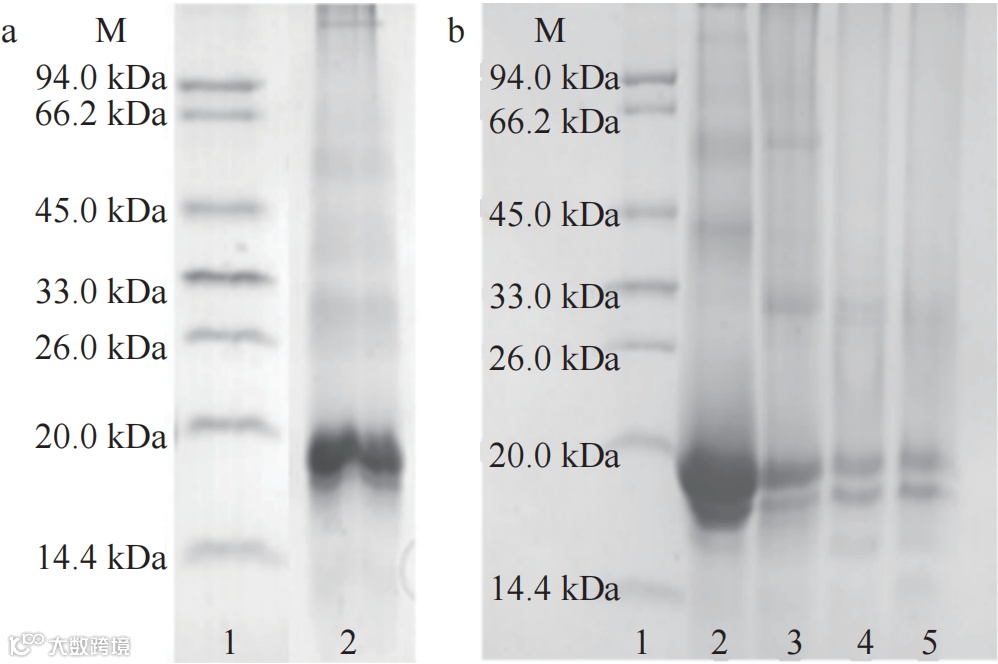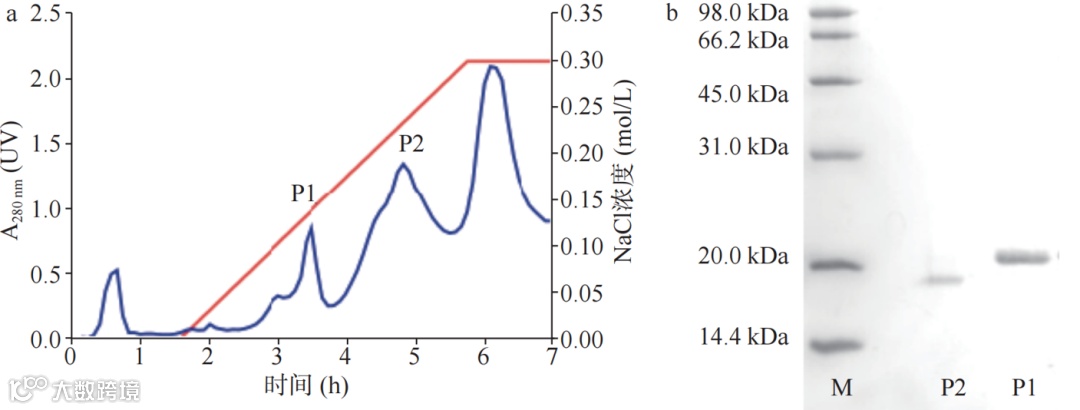 SDS-PAGE的结果显示葛根粗提液含有多种水溶性蛋白组分,蛋白质分子量分布范围在10~100kDa之间,其中含量最高的两个主要蛋白质分子量分别约18与20kDa。从葛根中抽提并分离纯化获得一种主要的水溶性蛋白,命名为PP。